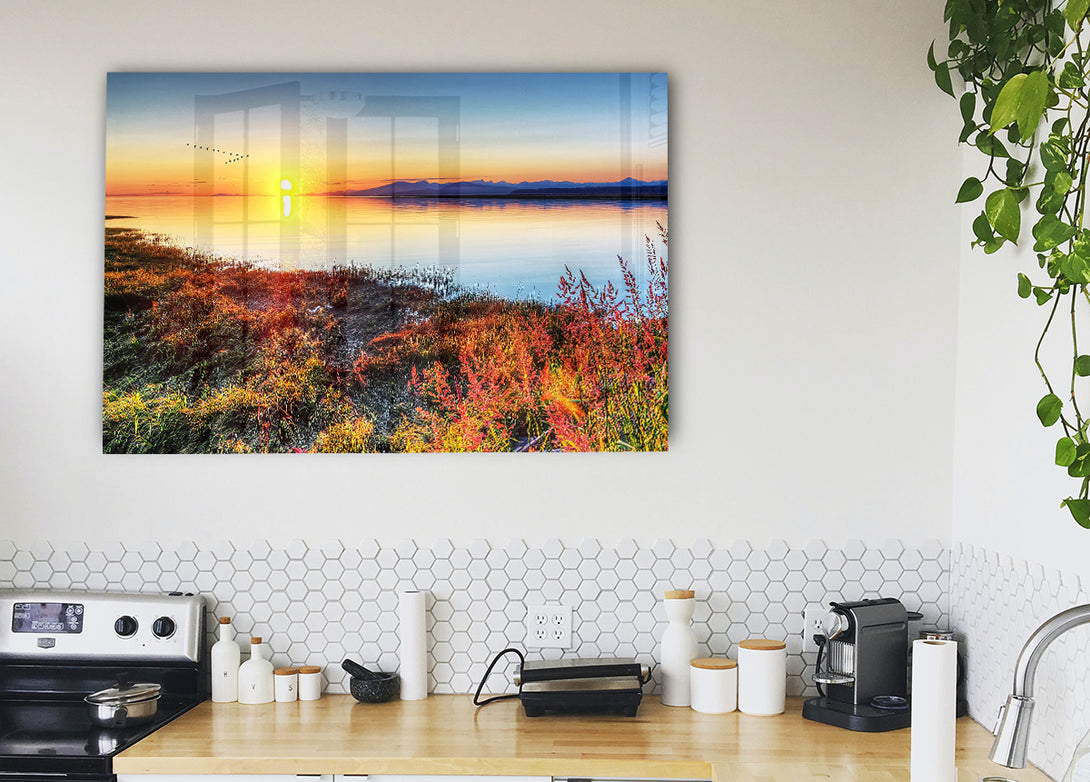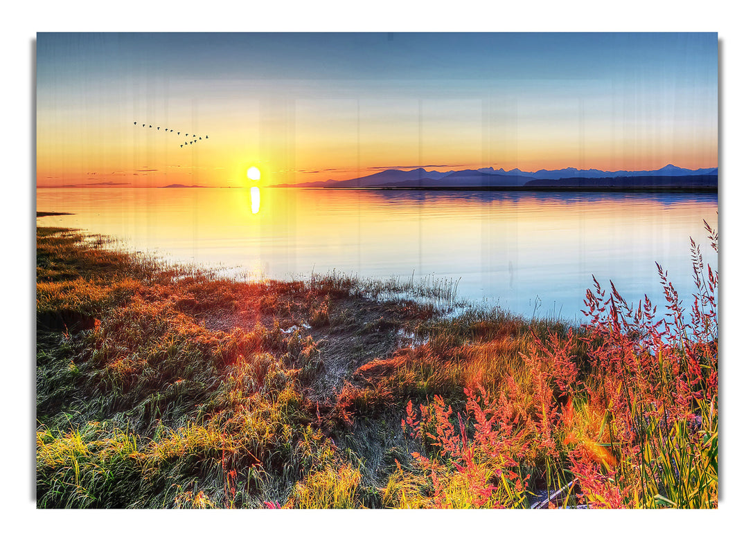Migratory Birds Flying Over The Mountain Lake acrylic print, UV printed onto 5mm thick acrylic glass. Comes with everything you need to hang on your wall.