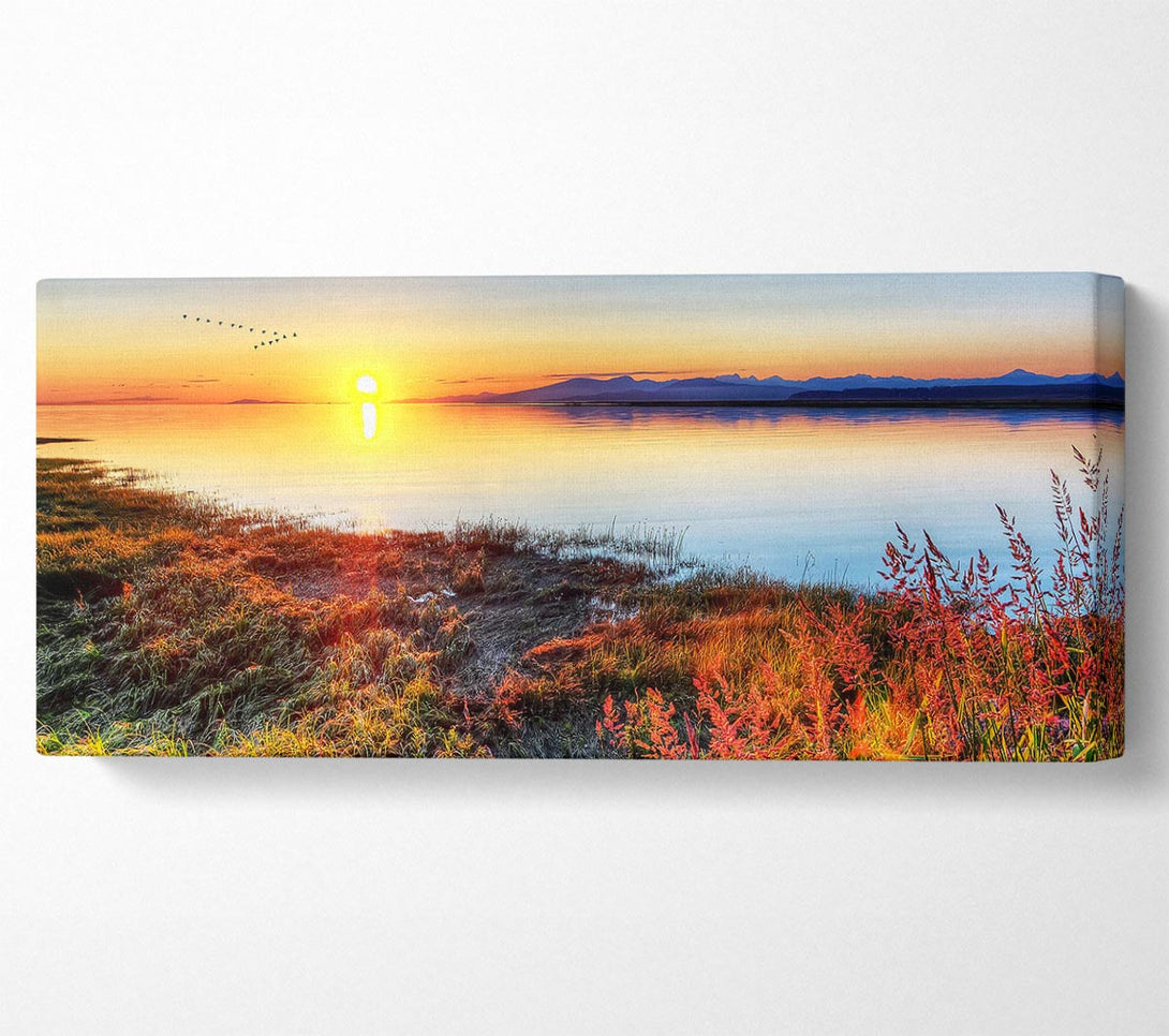 Migratory Birds Flying Over The Mountain Lake canvas, printed on coated polyester canvas. Mounted on to a 44mm box frame, ready to hang.