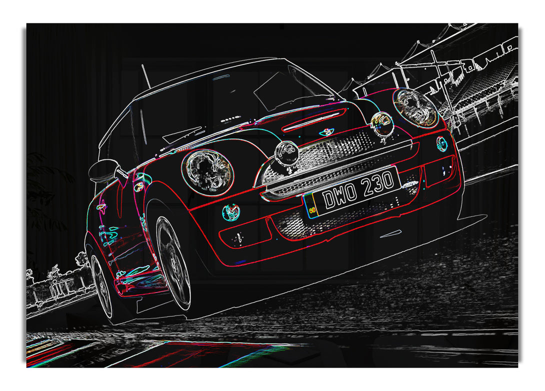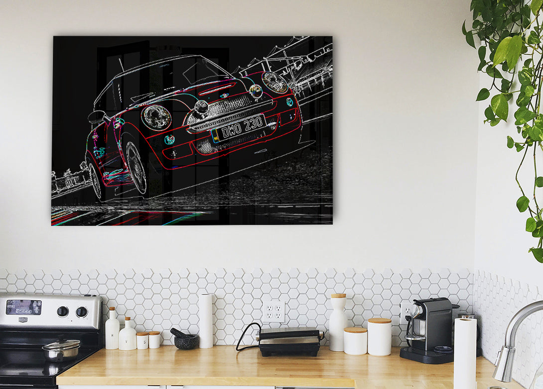 Mini Cooper Track Day acrylic print, UV printed onto 5mm thick acrylic glass. Comes with everything you need to hang on your wall.