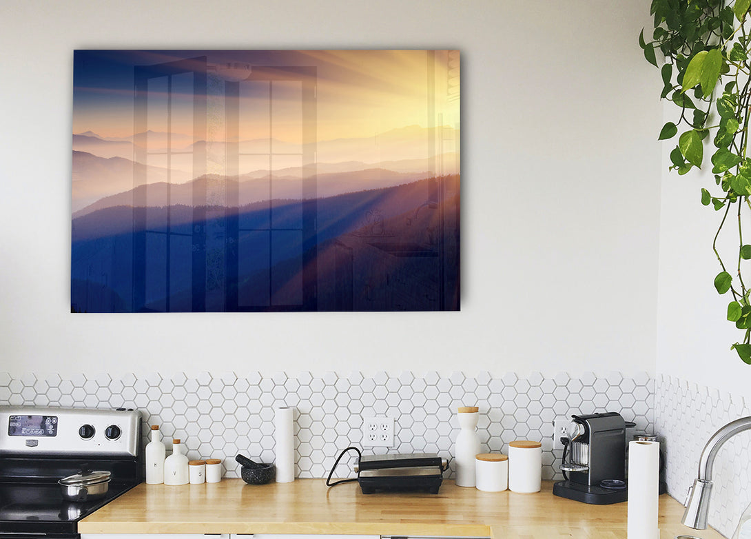 Misty Sunrise Mountains acrylic print, UV printed onto 5mm thick acrylic glass. Comes with everything you need to hang on your wall.