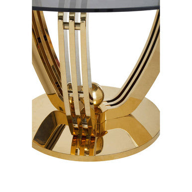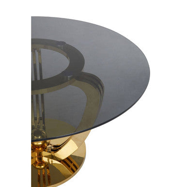 Stainless steel frame finished in brushed gold forms uniquely curved angles that gradually open up from a single base bringing durability to it. The base is topped with grey tempered glass which allows the light to flow in partially creating a balance and a contrast.