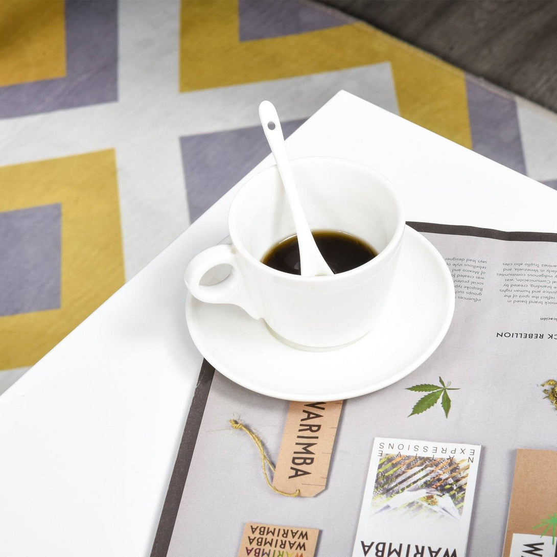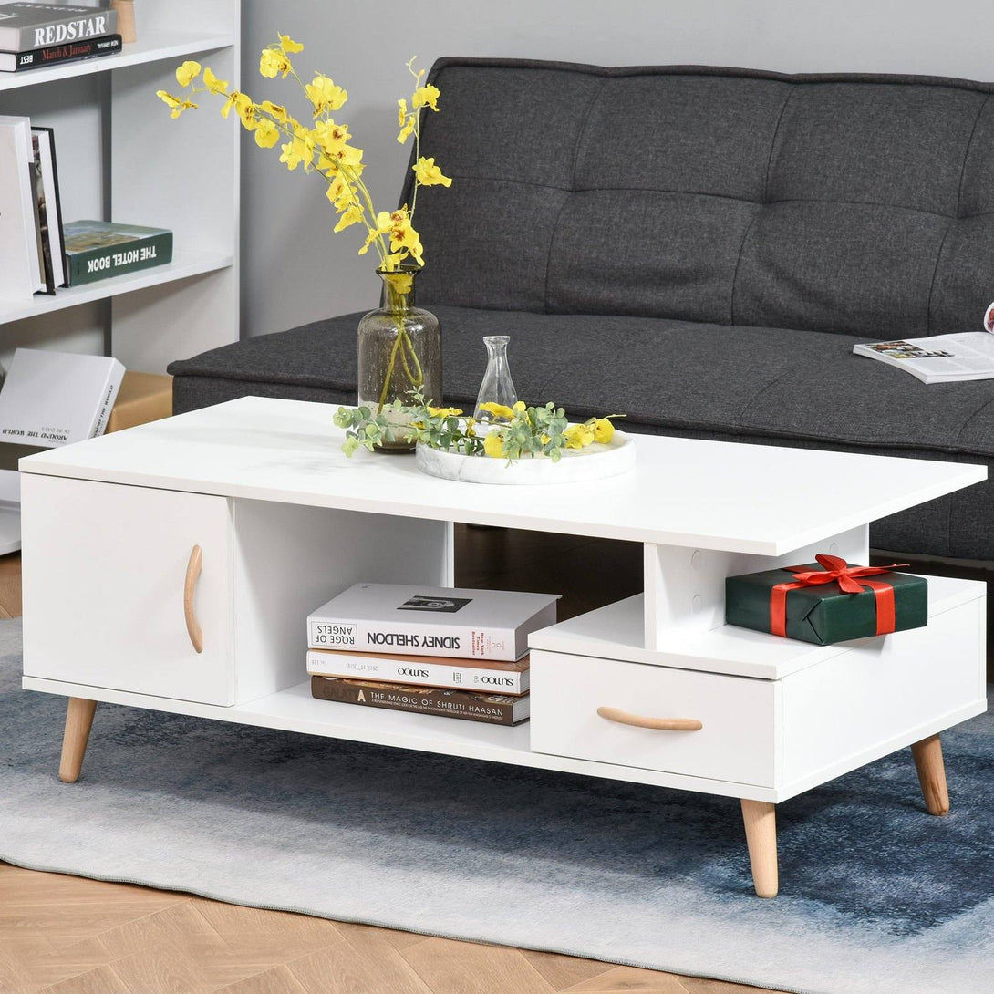 Do it differently this season. This long cocktail table is crafted into a unique look to make your home stand out. It's got two layers, with the right side cut out in-between the table top and drawer. Crafted from particle board, this living room table is durable, with four wooden legs on the bottom for balance and support. Comes with a cabinet, drawer and table top, so there's plenty of storage in this white coffee table. Finished with wooden handles on the doors to open and close easily.