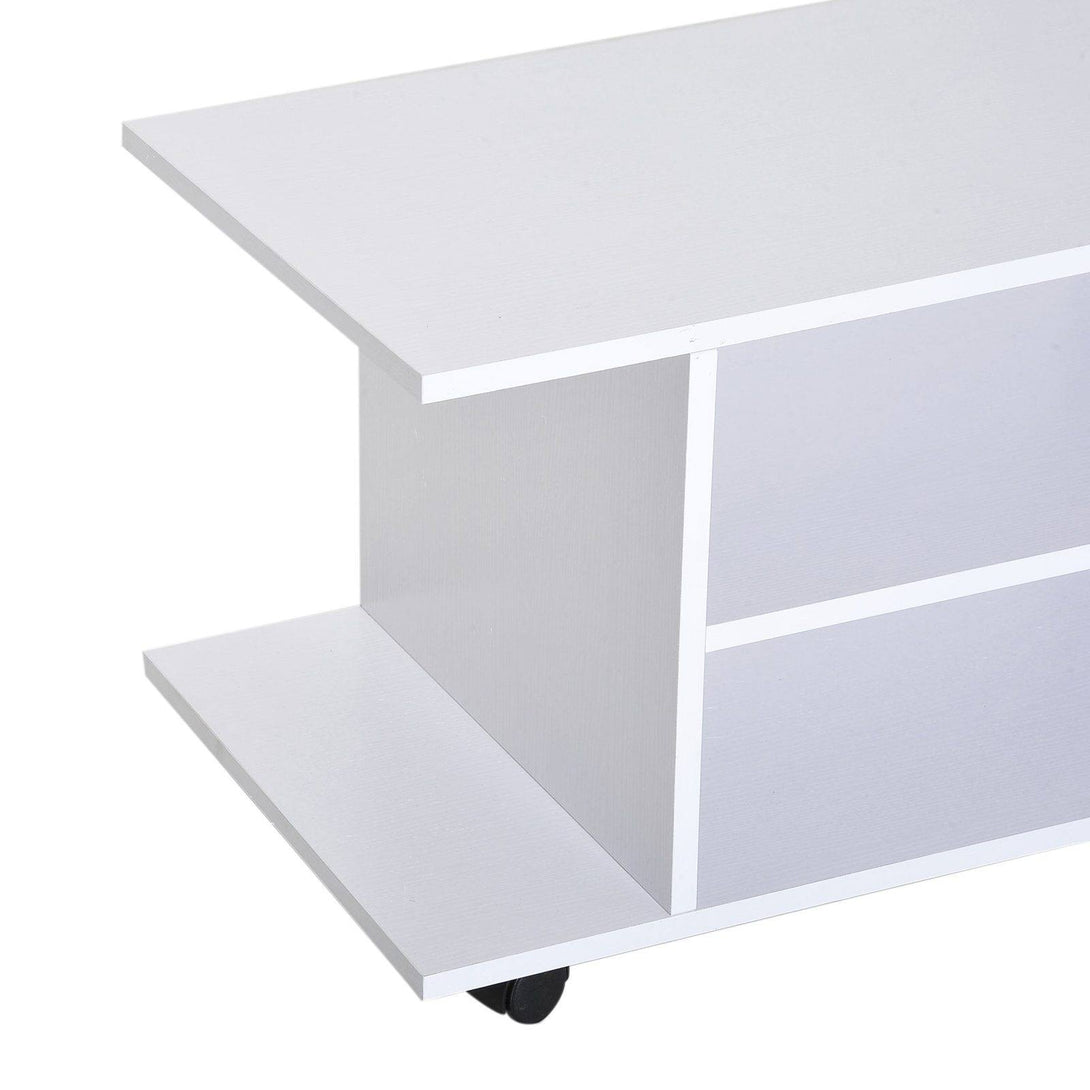 Upgrade your living room with this HOMCOM entertainment unit for 42-inch TV. This white TV stand does more than holding your TV, it has four storage compartments to provide large storage space for your favourite movies, a collection of video games or books you love to read. Four rolling castor wheels under the media console enable you to move it with ease to wherever you'd like. Without a doubt, it will be an ideal companion for your relaxing moments.
