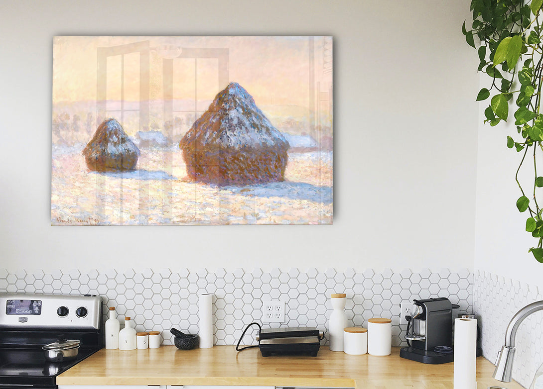 Monet Wheatstacks, Snow Effect In Morning acrylic print, UV printed onto 5mm thick acrylic glass. Comes with everything you need to hang on your wall.