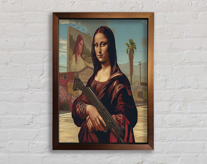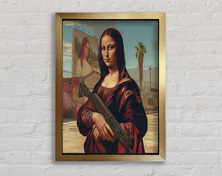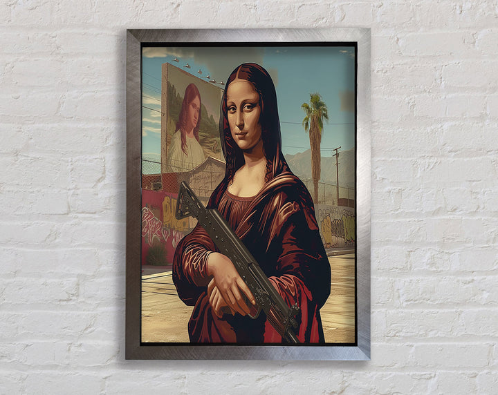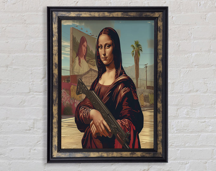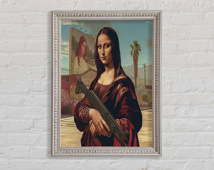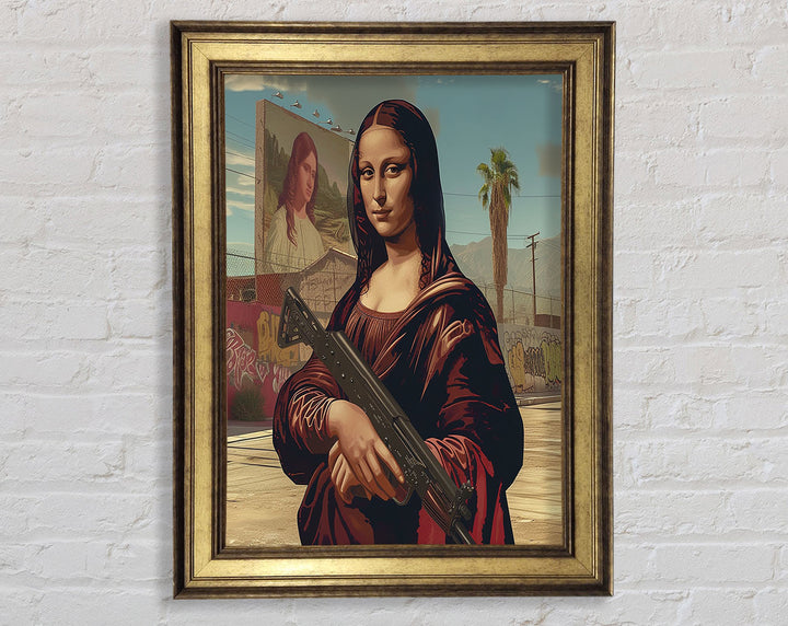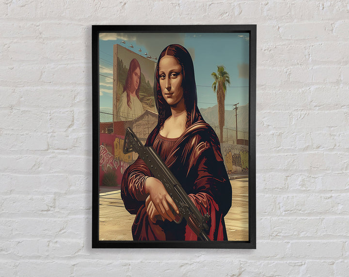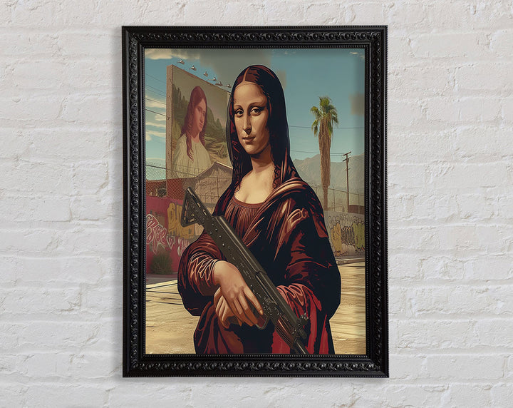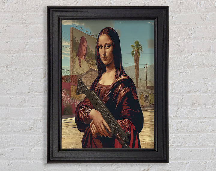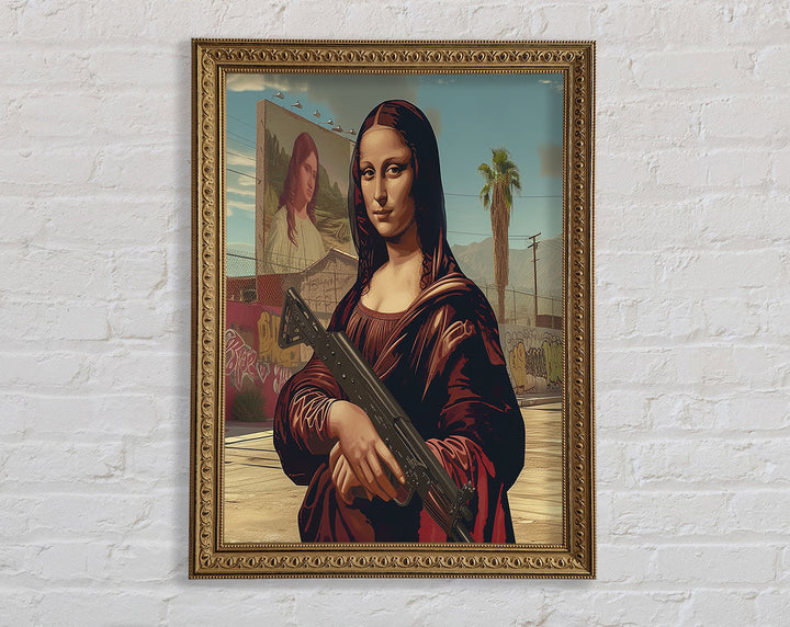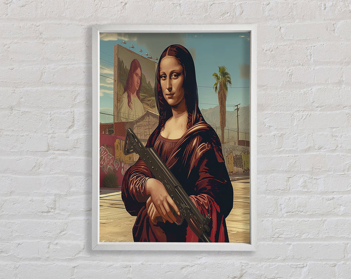 Introducing the Mono Lisa Gun Framed Print, a unique piece of framed art that merges classic beauty with modern edge. This striking artwork is available in six sizes, ranging from small to oversized, ensuring a perfect fit for any space. Choose from a variety of vibrant colors to match your decor. Each print is handmade in the United Kingdom, guaranteeing exceptional craftsmanship and attention to detail. The print comes ready to hang, making it easy to add a touch of sophistication and intrigue to your home or office. Elevate your wall decor with this distinctive and conversation-starting piece.