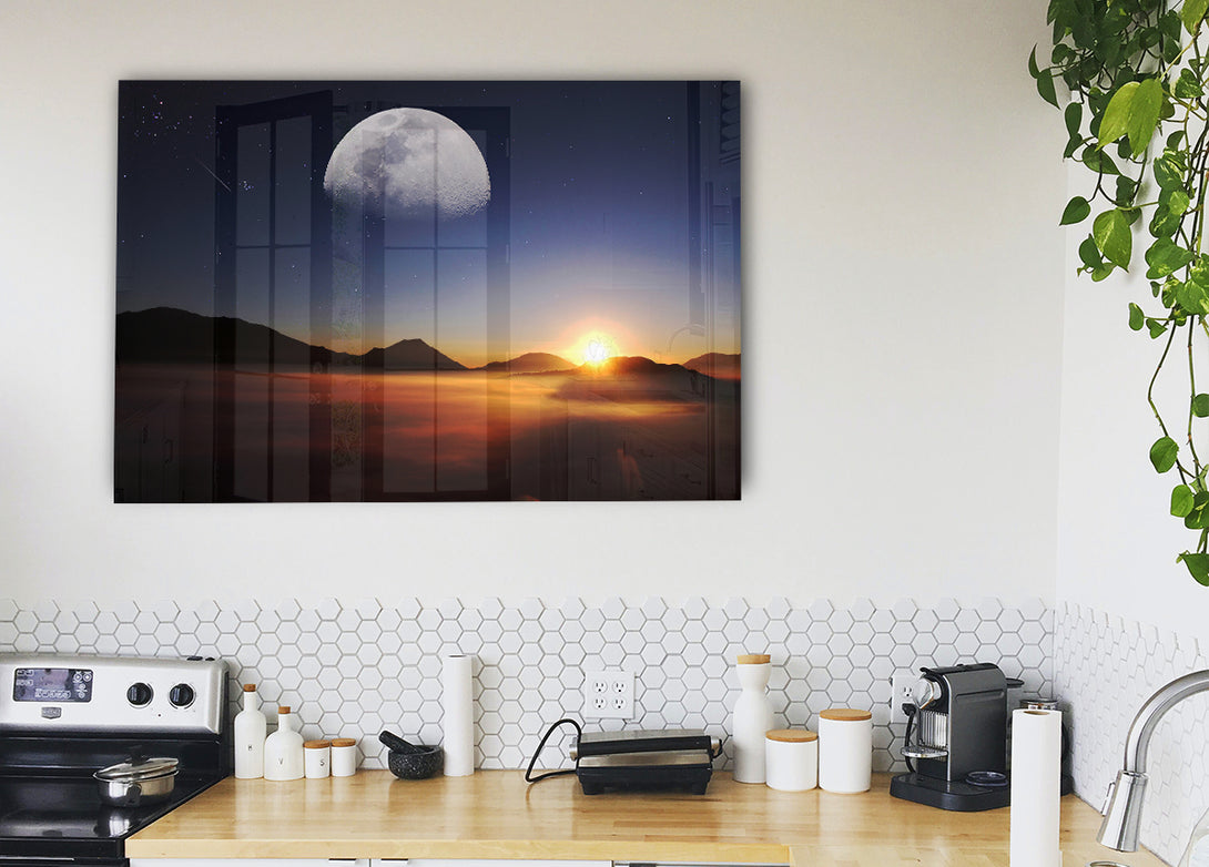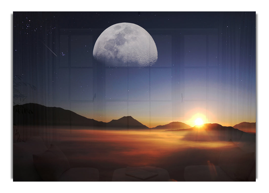 Moon Above The Mountain Sunset acrylic print, UV printed onto 5mm thick acrylic glass. Comes with everything you need to hang on your wall.
