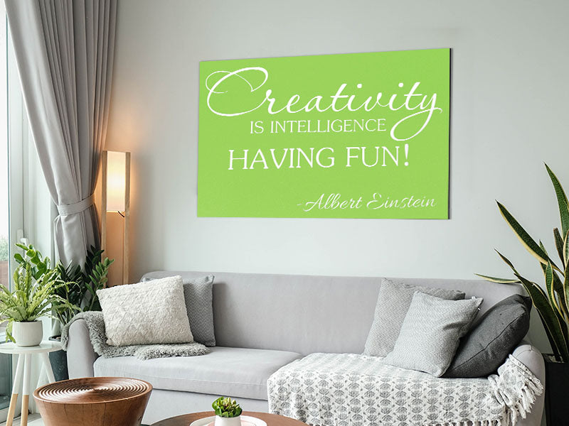 Motivational Quote Albert Einstein Creativity Is Intelligence Lime Green Printed on brushed aluminium dibond. A modern way to display art and easy to maintain.