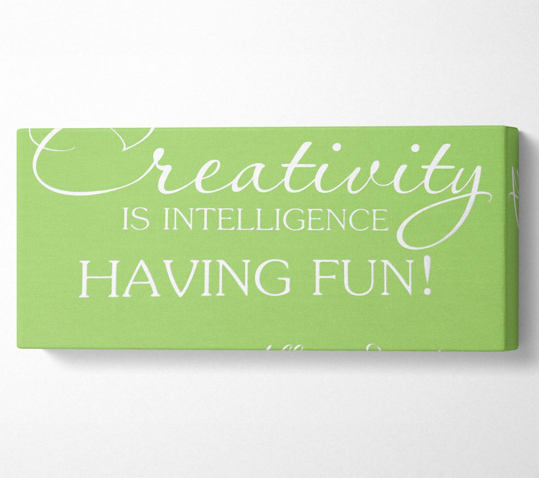 Motivational Quote Albert Einstein Creativity Is Intelligence Lime Green canvas, printed on coated polyester canvas. Mounted on to a 44mm box frame, ready to hang.