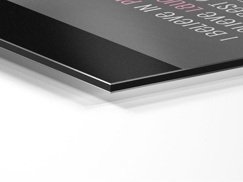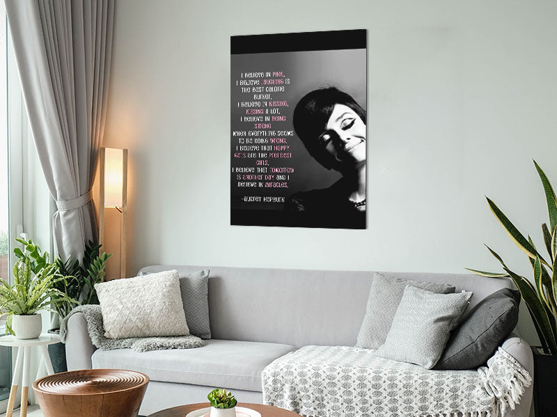 Motivational Quote Audrey Hepburn I Believe In Pink Portrait Printed on brushed aluminium dibond. A modern way to display art and easy to maintain.