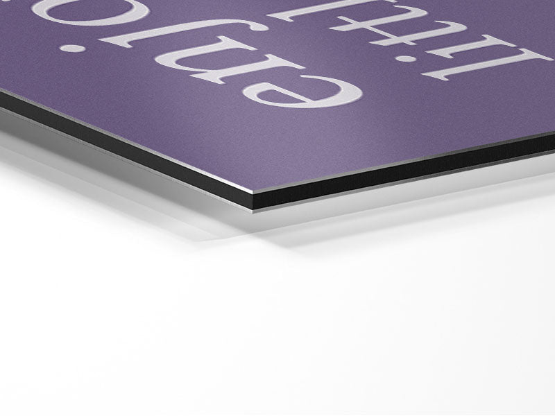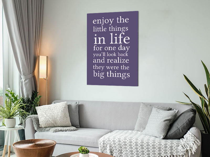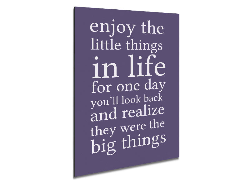 Motivational Quote Enjoy The Little Things In Life Lilac Printed on brushed aluminium dibond. A modern way to display art and easy to maintain.