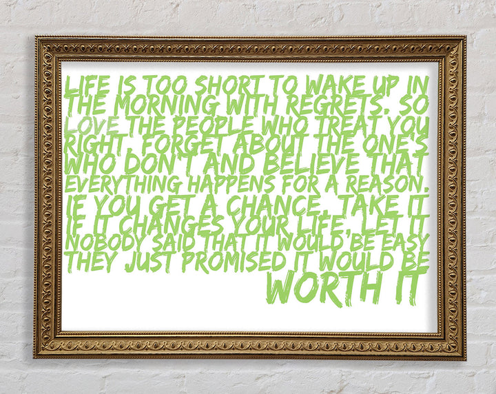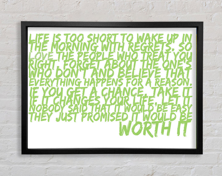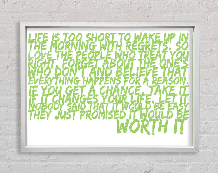 Brighten up your space with the Motivational Quote "Life Is Too Short, You're Worth It" Lime Green Framed Print. This inspiring piece of framed art is perfect for any room, bringing positivity and motivation to your daily life. Available in six sizes, from small to oversized, it fits perfectly in any space. Choose from a variety of colors to match your decor. Handmade in the United Kingdom, each print is crafted with care and attention to detail. Ready to hang right out of the box, it’s an effortless way to add a touch of encouragement to your home or office. Let this beautiful framed print remind you every day that you are worth it!