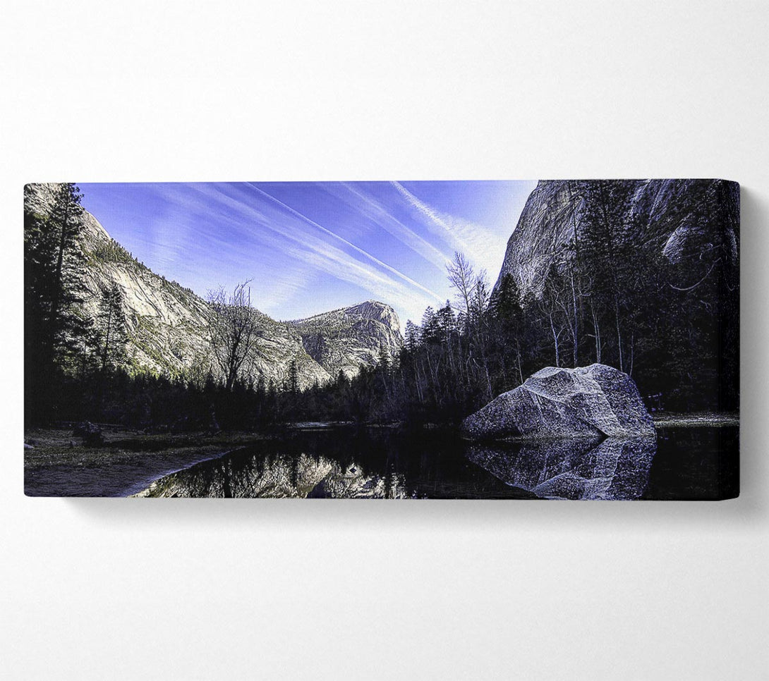 Mountain Lake Reflections canvas, printed on coated polyester canvas. Mounted on to a 44mm box frame, ready to hang.