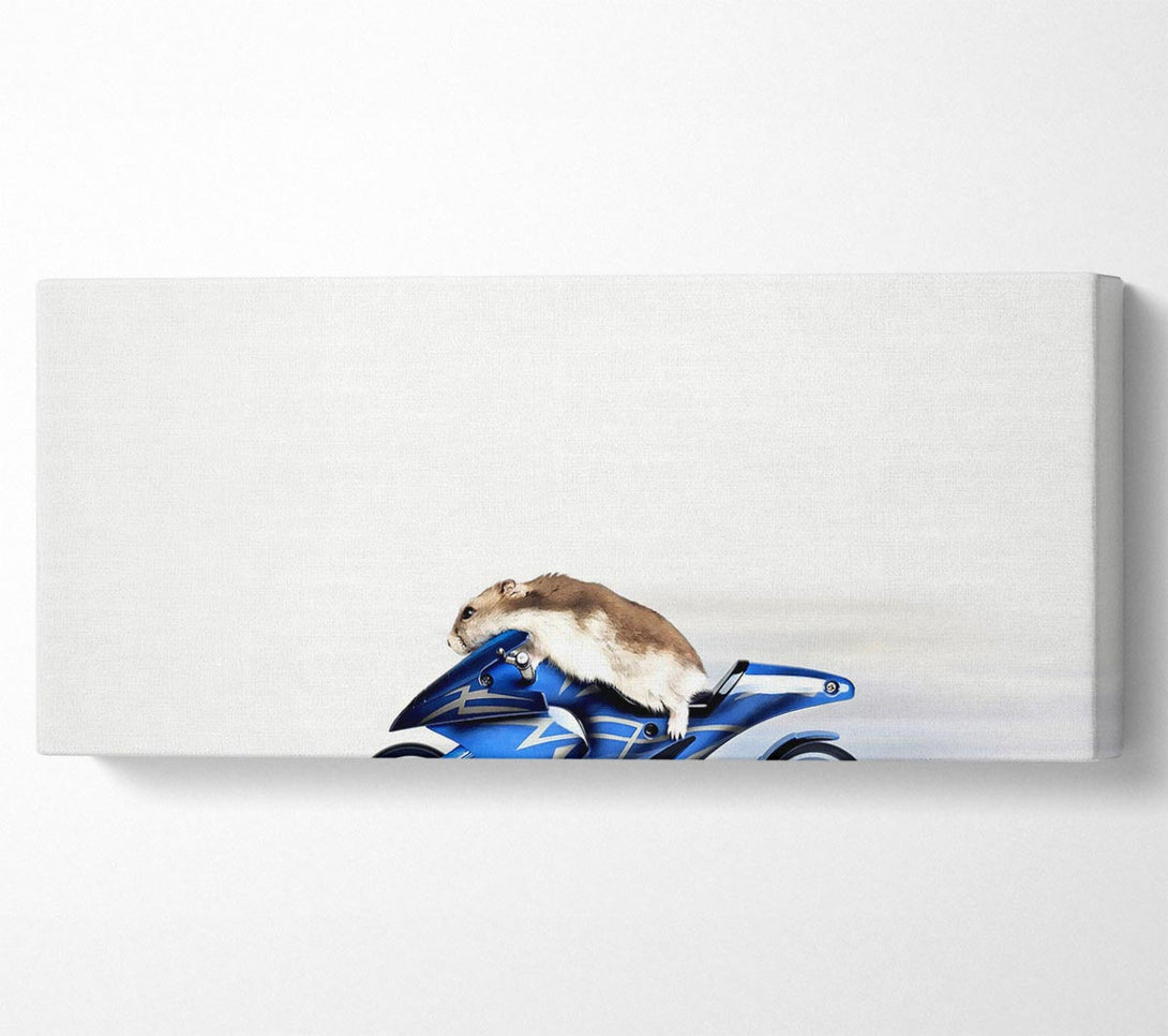 Mouse Riding Motorcycle canvas, printed on coated polyester canvas. Mounted on to a 44mm box frame, ready to hang.