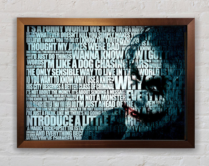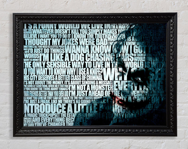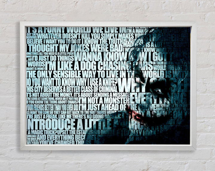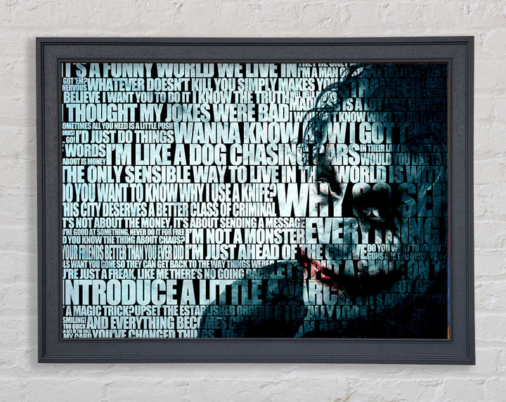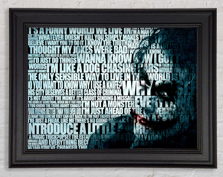 Add a touch of cinematic charm to your space with the Movie Quote The Joker Funny World Framed Print. This stunning framed art piece features a memorable quote from the iconic character, The Joker. Available in six sizes, from small to oversized, you can choose the perfect fit for any room. With a variety of colors to match your decor, this print is designed to complement any style. Each piece is handmade in the United Kingdom, ensuring top-notch quality and craftsmanship. Ready to hang right out of the box, this framed print makes it easy to add a dash of movie magic to your home or office.