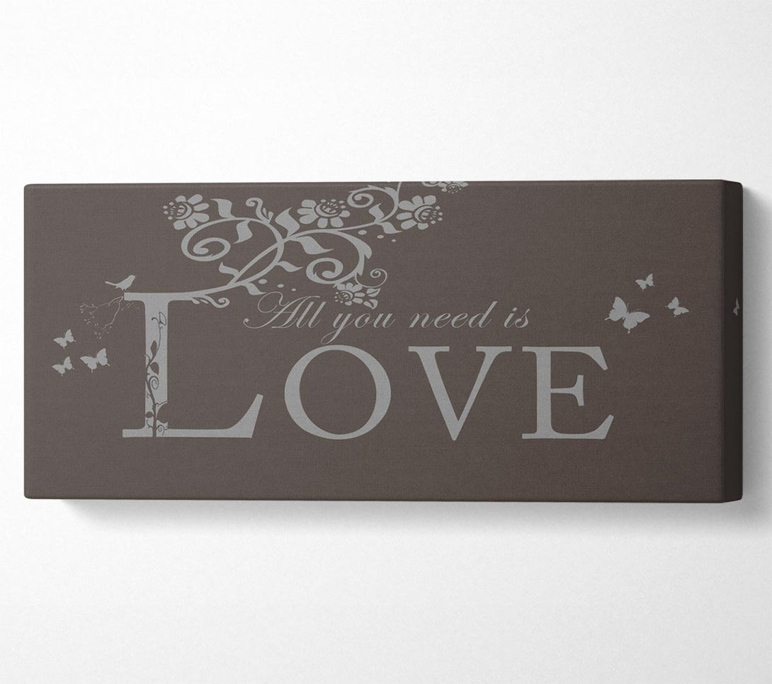 Music Quote All You Need Is Love Chocolate canvas, printed on coated polyester canvas. Mounted on to a 44mm box frame, ready to hang.