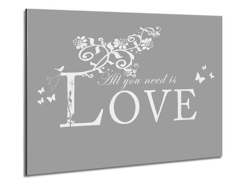 Music Quote All You Need Is Love Grey White Printed on brushed aluminium dibond. A modern way to display art and easy to maintain.