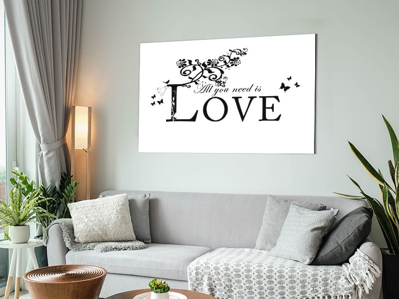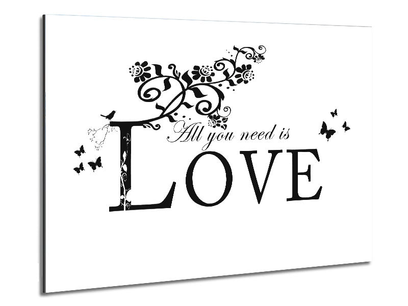 Music Quote All You Need Is Love White Printed on brushed aluminium dibond. A modern way to display art and easy to maintain.