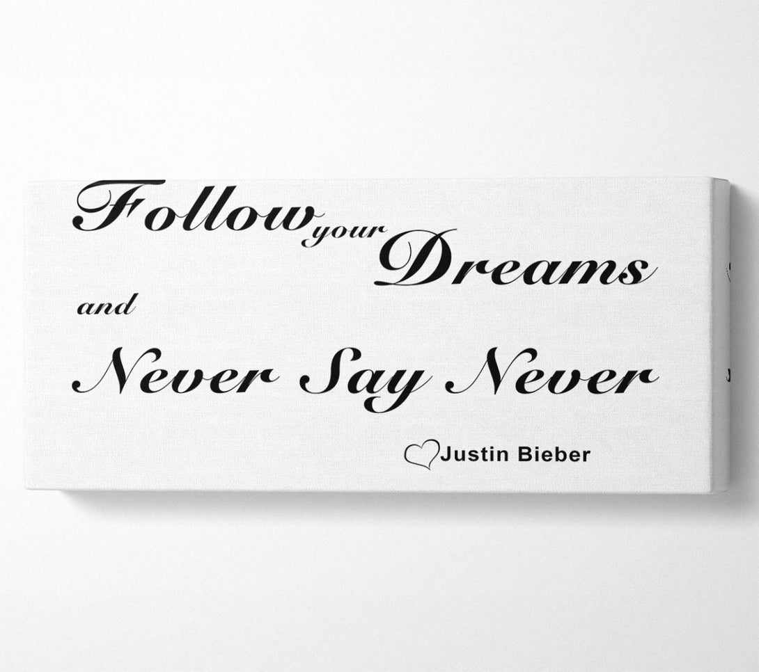 Music Quote Follow Your Dreams Justin Bieber White canvas, printed on coated polyester canvas. Mounted on to a 44mm box frame, ready to hang.