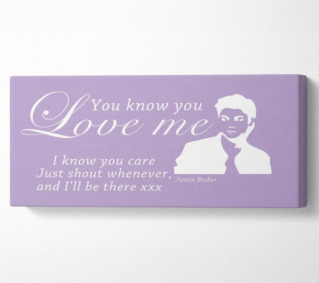 Music Quote You Know You Love Me Justin Bieber Lilac canvas, printed on coated polyester canvas. Mounted on to a 44mm box frame, ready to hang.
