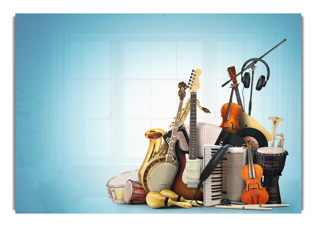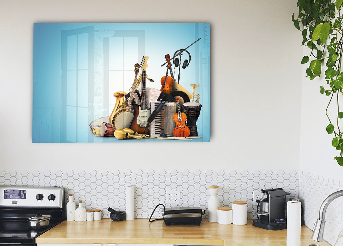 Musical instruments band acrylic print, UV printed onto 5mm thick acrylic glass. Comes with everything you need to hang on your wall.