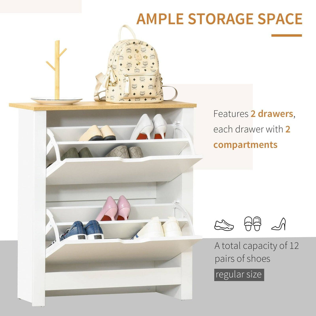 This compact shoe cabinet from HOMCOM will help to keep your home effortlessly decluttered. A particle board construction ensures a tough and solid frame, with a smooth coating so it can be cleaned easily. Two pull-down drawers hold two shelves each, which stores up to 12 pairs of shoes for easy organisation. A groove handle allows you to open and close. An oak-tone top allows extra holding and display space, with feet to keep the unit balanced.