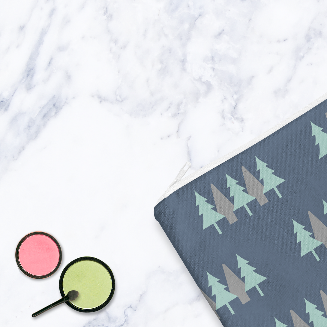 Navy Blue Scandinavian Forest Makeup Bag - Handmade Cosmetic Pouch with Water Resistant Lining - Dog Lover Gift - Travel Beauty Bag