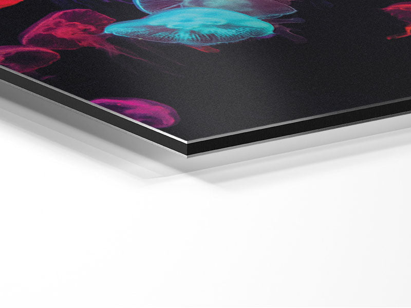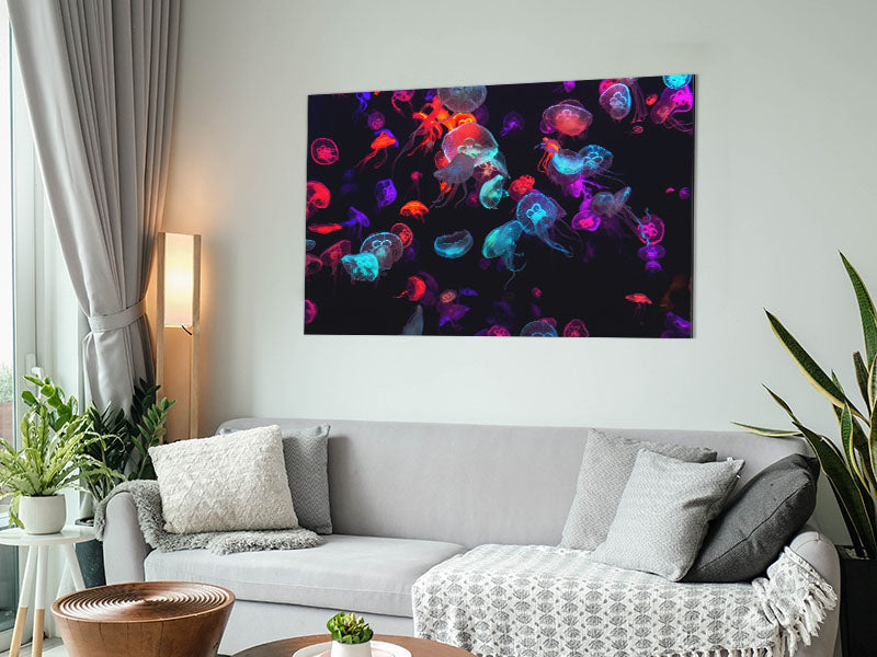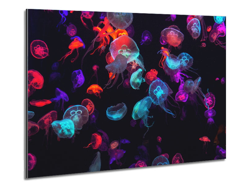 Neon Jellyfish frenzy Printed on brushed aluminium dibond. A modern way to display art and easy to maintain.