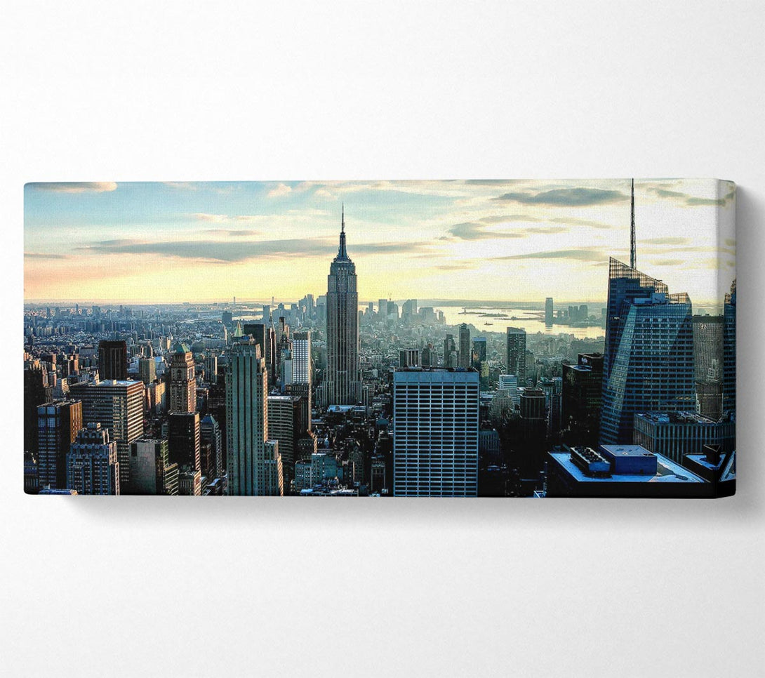 New York View Below The Sky canvas, printed on coated polyester canvas. Mounted on to a 44mm box frame, ready to hang.
