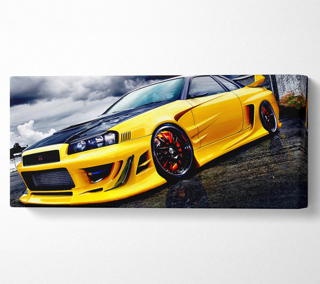 Nissan Skyline Yellow canvas, printed on coated polyester canvas. Mounted on to a 44mm box frame, ready to hang.