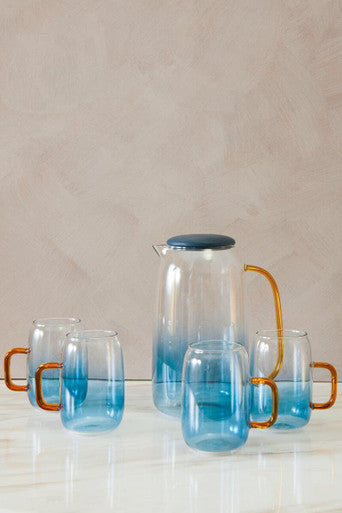 This set with four glasses with handles and a jug with a handle and lid blends functionality and artistry with amber handles and a blue ombre. The glasses and jug gently taper at the top, adding to the style. The amber glass handles elegantly contrasts with the blue. The glass jug is ideal for mixing long drinks, classic cocktails or juices.