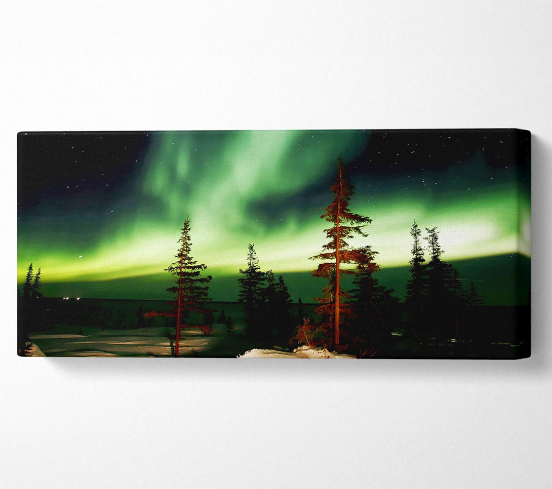 Northern Lights Green canvas, printed on coated polyester canvas. Mounted on to a 44mm box frame, ready to hang.