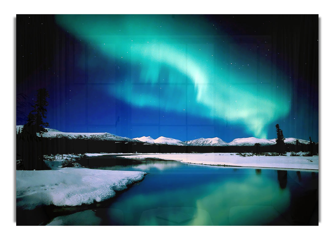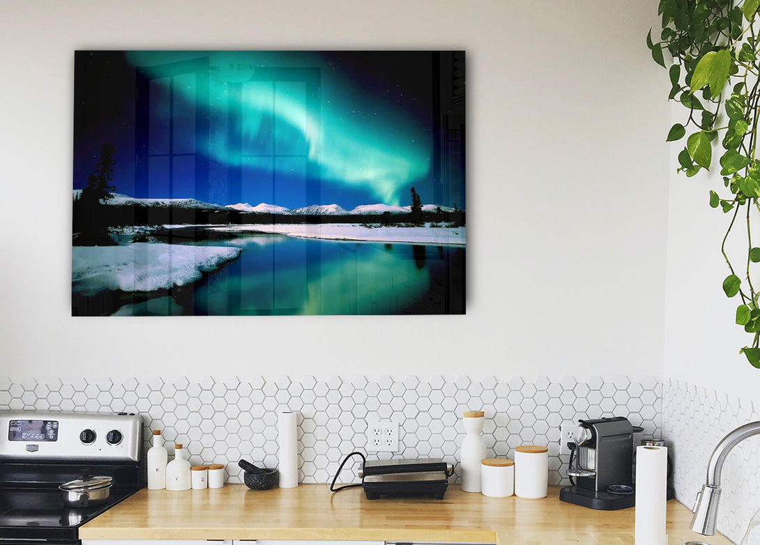 Northern Lights Lake View acrylic print, UV printed onto 5mm thick acrylic glass. Comes with everything you need to hang on your wall.