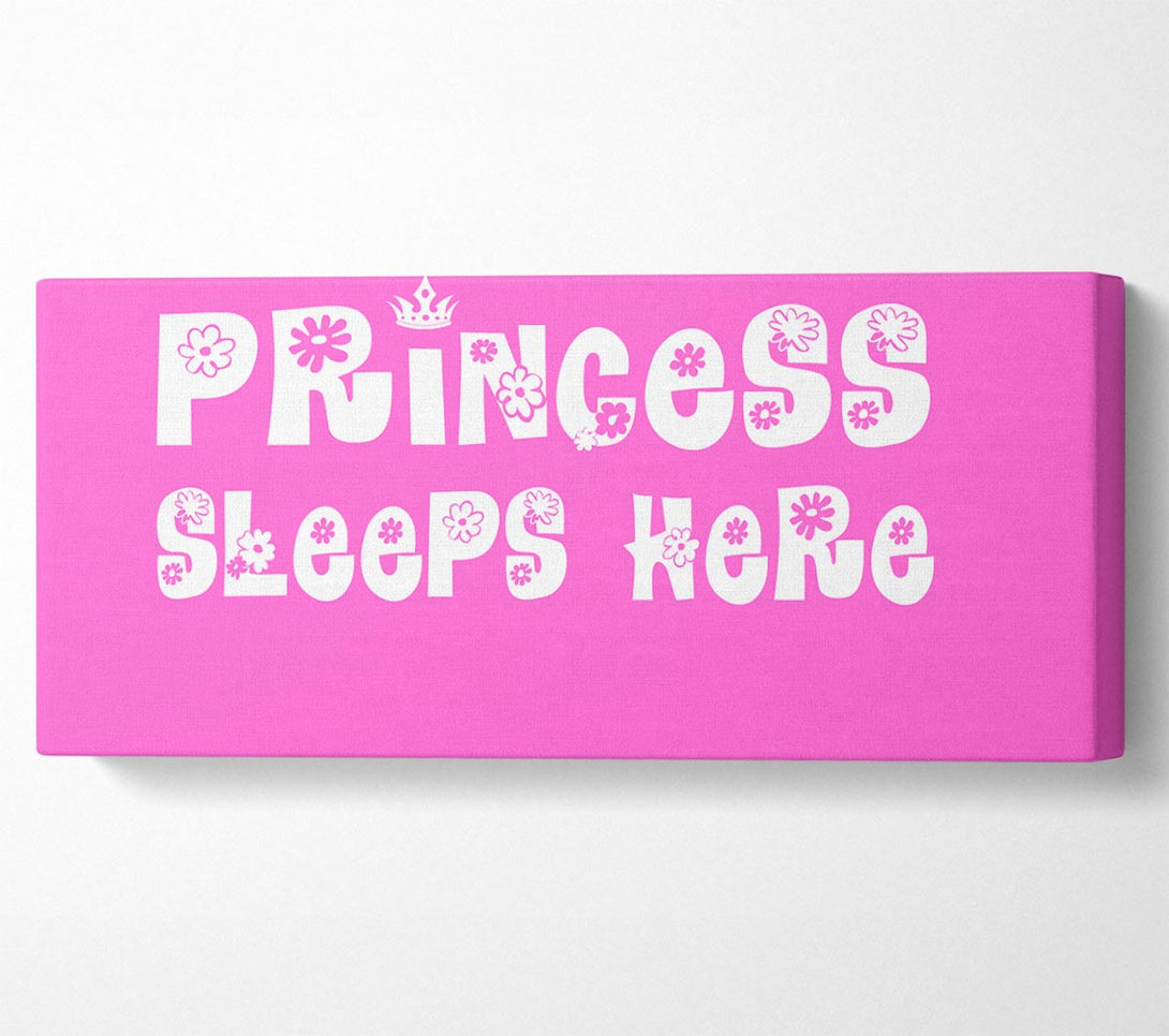 Nursery Quote Princesss Sleeps Here Vivid Pink canvas, printed on coated polyester canvas. Mounted on to a 44mm box frame, ready to hang.