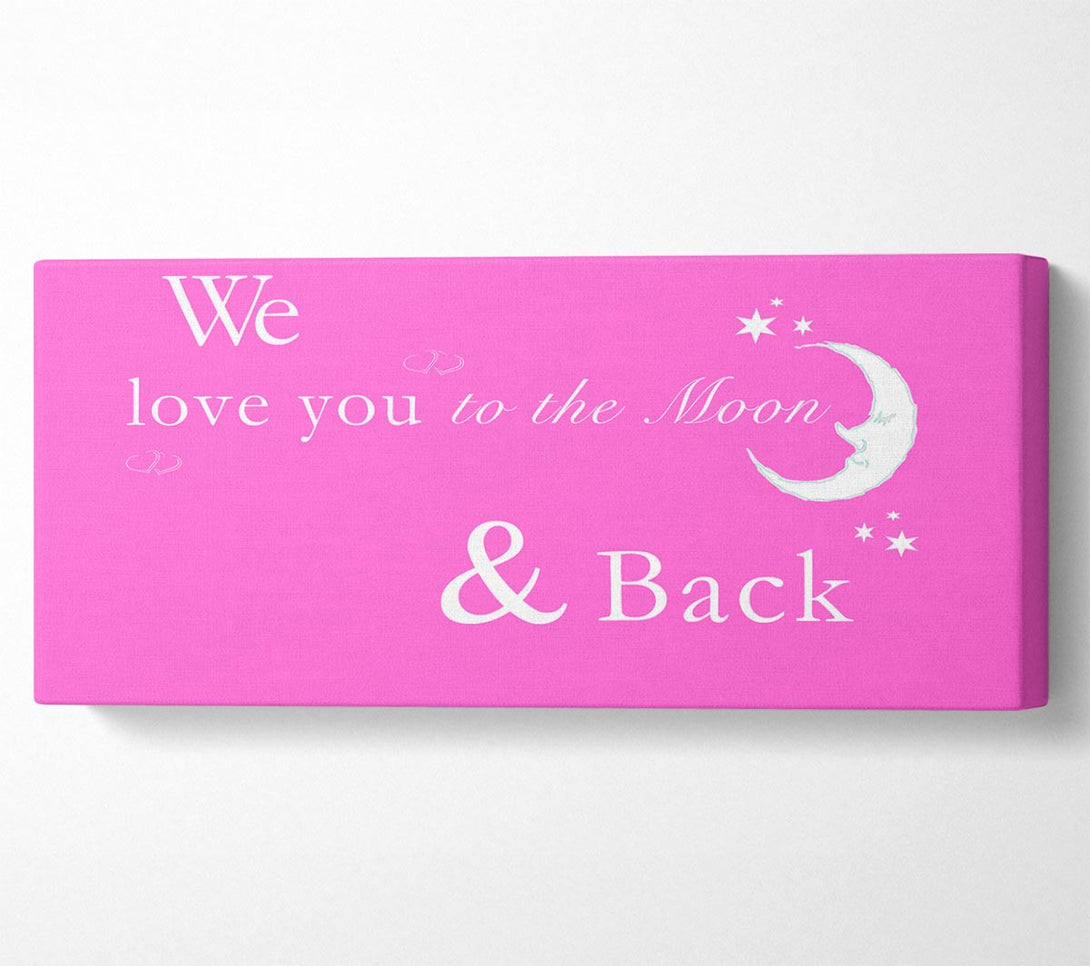Nursery Quote We Love You To The Moon And Back 2 Vivid Pink canvas, printed on coated polyester canvas. Mounted on to a 44mm box frame, ready to hang.