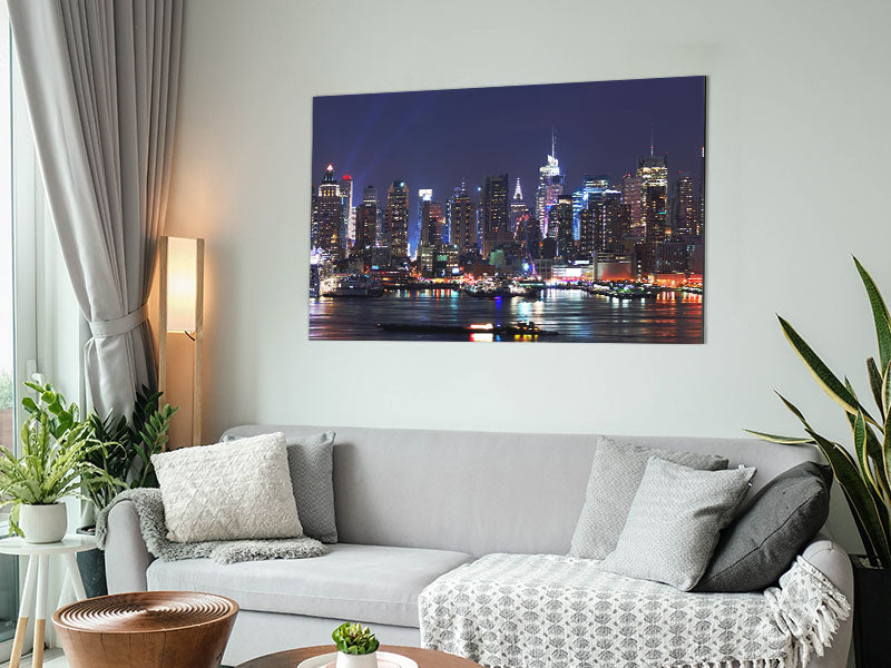 NYC Harbour At Night Printed on brushed aluminium dibond. A modern way to display art and easy to maintain.