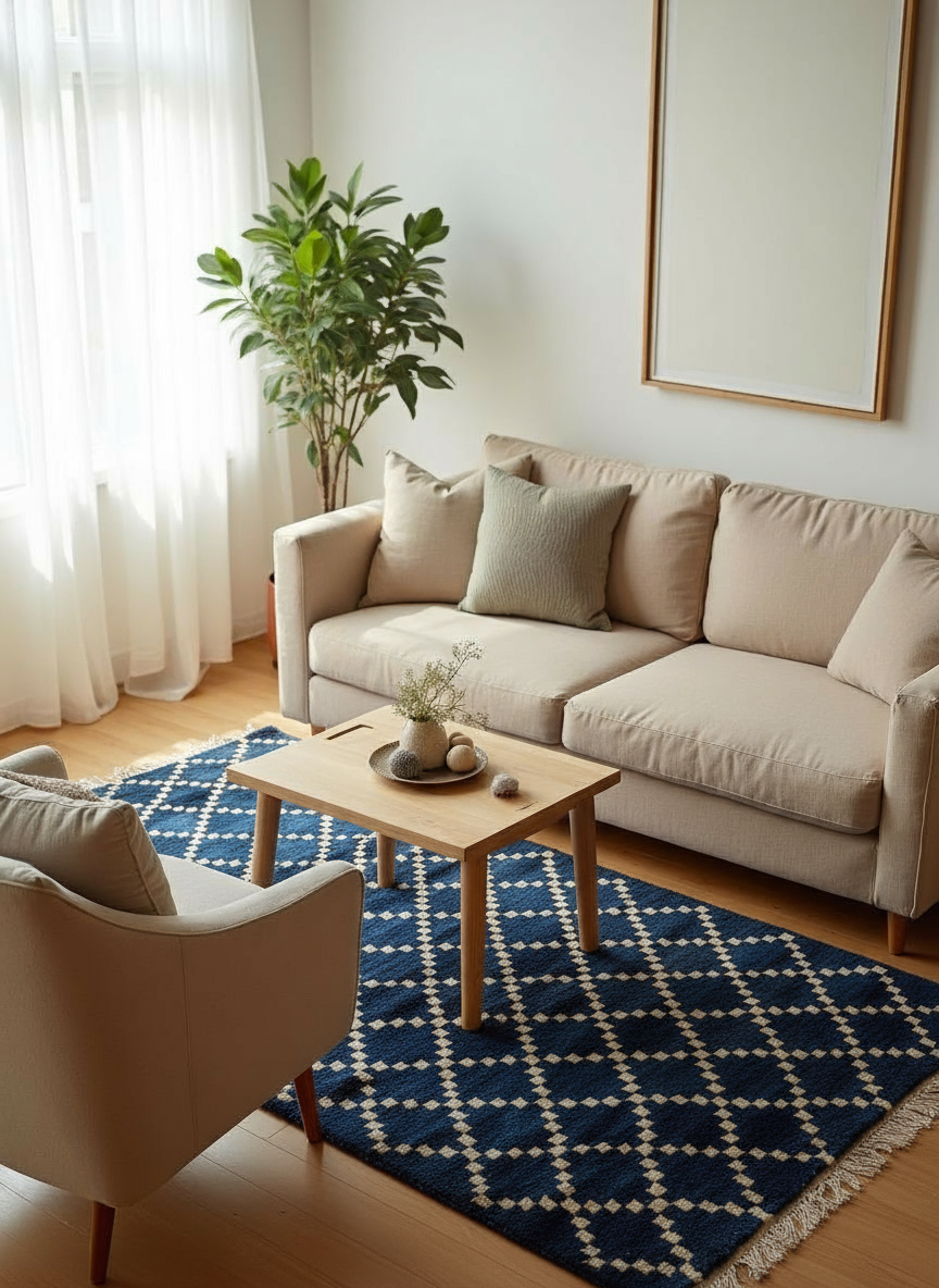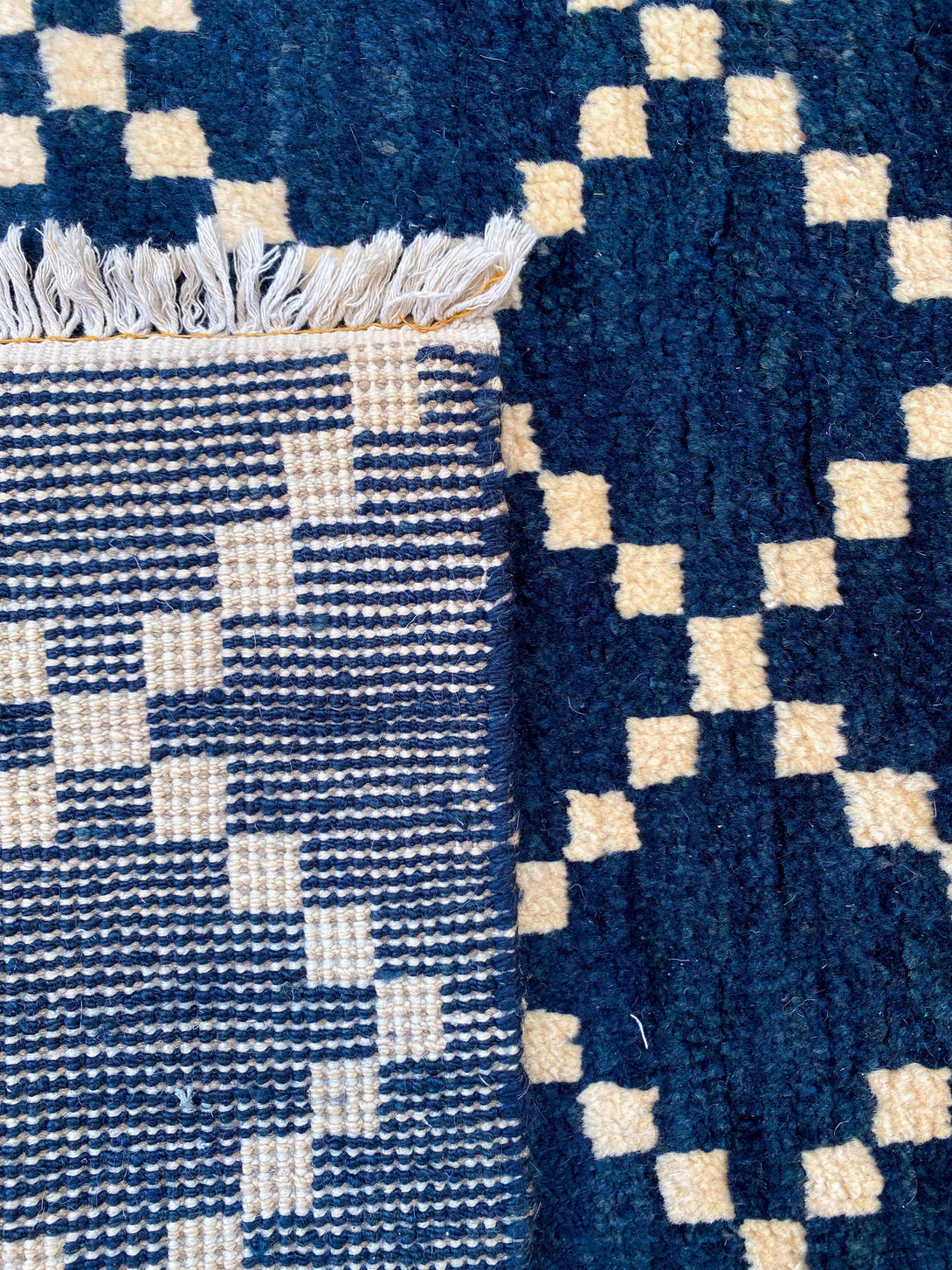 Handcrafted using traditional techniques, this Moroccan Textured Rug is made from high-quality wool for a soft, plush feel underfoot. This diamond array geometrical pattern in white colour with a dark blue gradient effect in the background, adds a luxurious touch to your surroundings. Each rug is one-of-a-kind, featuring a range of colours and patterns inspired by the Moroccan weaving tradition.