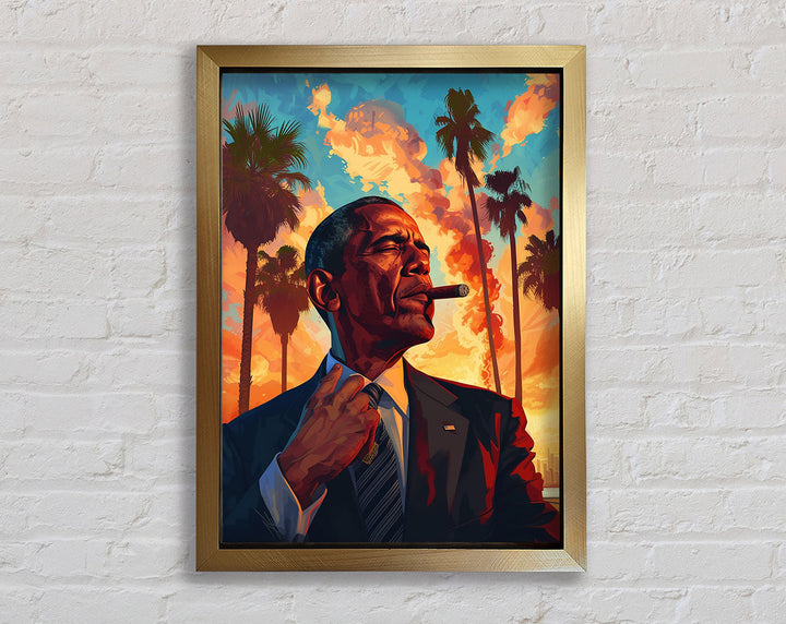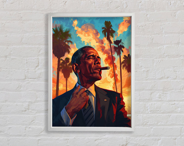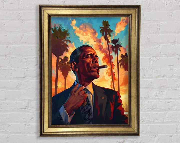 Introducing the Obama Cigar Framed Print, a stunning piece of framed art that captures the essence of sophistication and style. This unique artwork features a classic image of President Obama enjoying a cigar, making it a perfect addition to any room. Available in six sizes, from small to oversized, this print can fit any space you have in mind. Choose from a variety of colors to match your decor seamlessly. Each piece is handmade in the United Kingdom, ensuring exceptional quality and craftsmanship. Ready to hang, this framed print is an effortless way to elevate your home or office with elegance and historical significance.