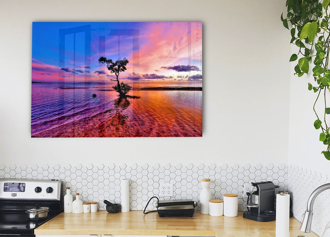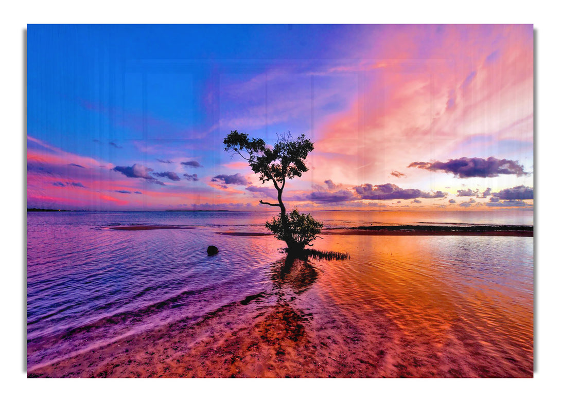 Ocean Tree Dusk acrylic print, UV printed onto 5mm thick acrylic glass. Comes with everything you need to hang on your wall.