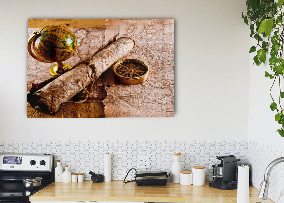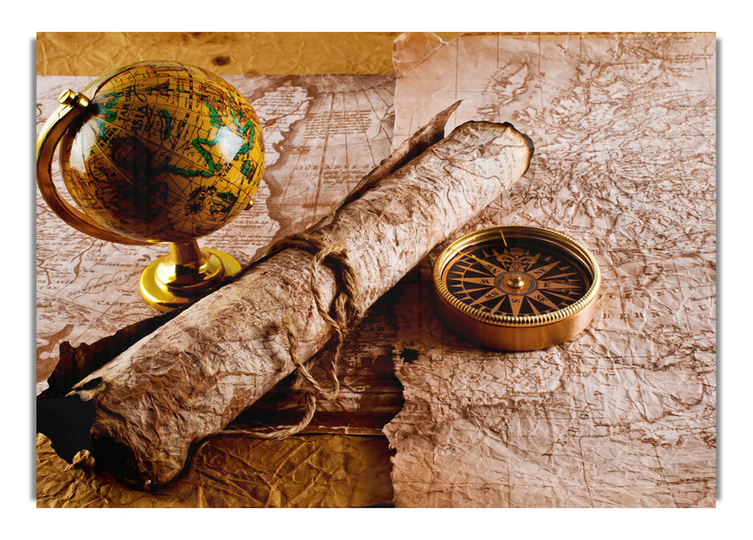 Old Maps And Compass With Globe acrylic print, UV printed onto 5mm thick acrylic glass. Comes with everything you need to hang on your wall.