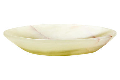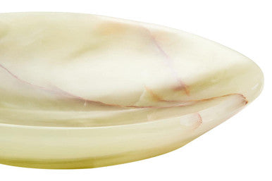 This decorative dish is handcrafted from natural onyx and shaped into a shallow oval form. Its smooth surface and earthy tones with natural veining make it a refined accent for coffee tables, consoles, or display settings, blending function with style. *This product is handcrafted, colours may vary due to the nature of the product.*