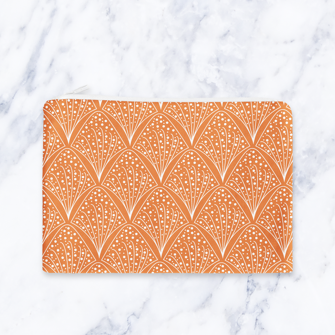 This is a cosmetic bag that I have made using a retro inspired orange and white fabric. The fabric and the bag are designed and handmade by Shadowbright. The bag is lined with a water resistant coated cotton.