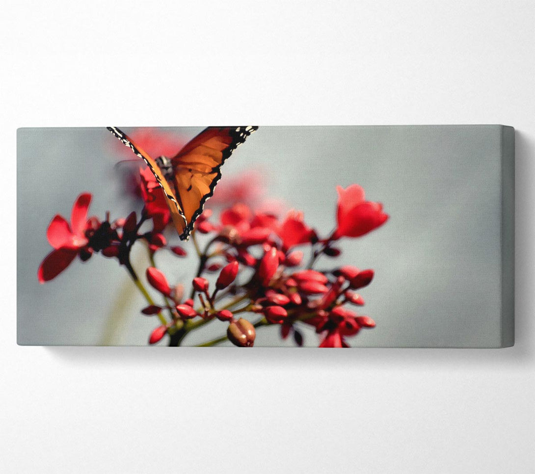 Orange Butterfly On Flower canvas, printed on coated polyester canvas. Mounted on to a 44mm box frame, ready to hang.
