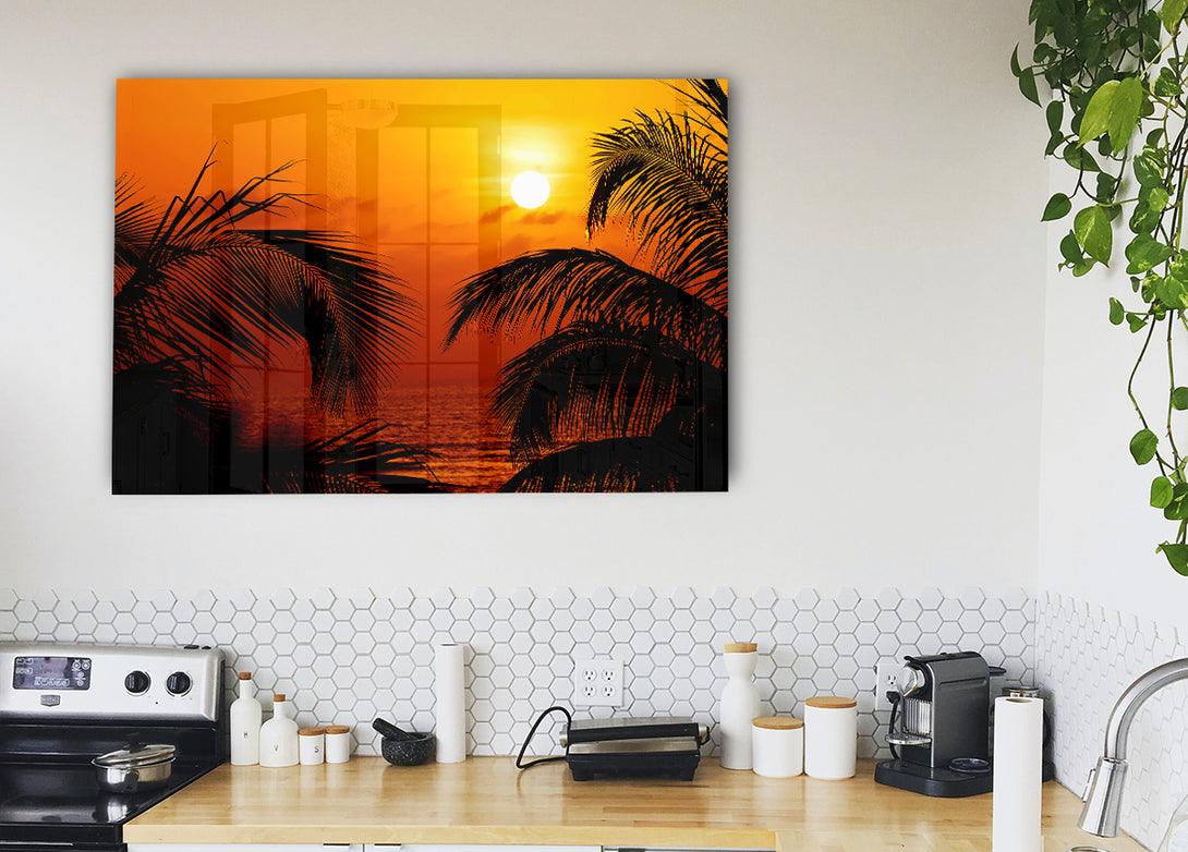 Orange Palmtree Sun acrylic print, UV printed onto 5mm thick acrylic glass. Comes with everything you need to hang on your wall.