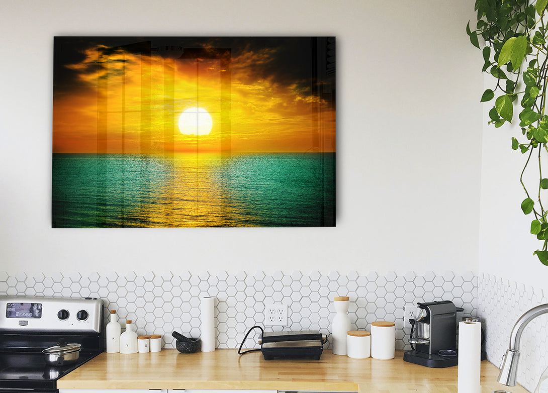 Orange Sun Reflections On The Green Ocean acrylic print, UV printed onto 5mm thick acrylic glass. Comes with everything you need to hang on your wall.