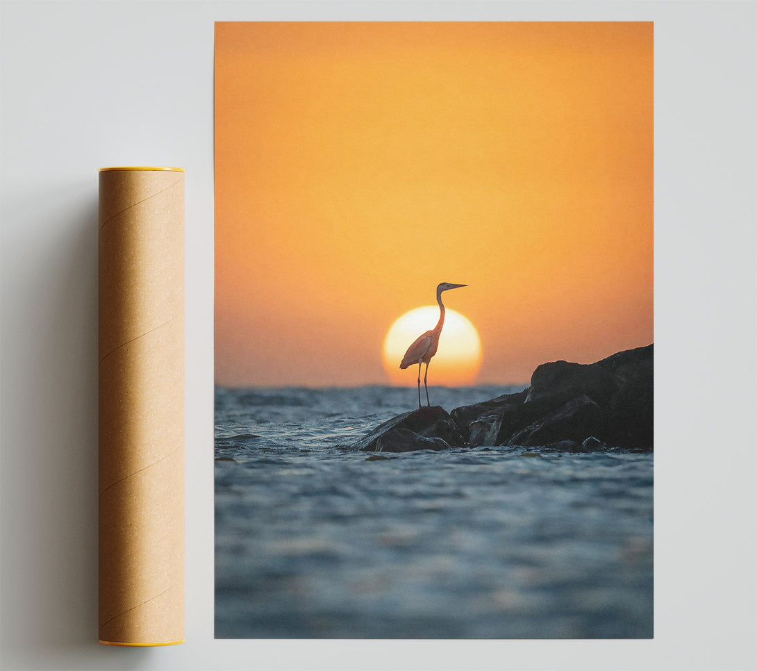 Orange Sunset Heron Poster