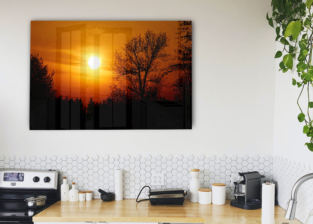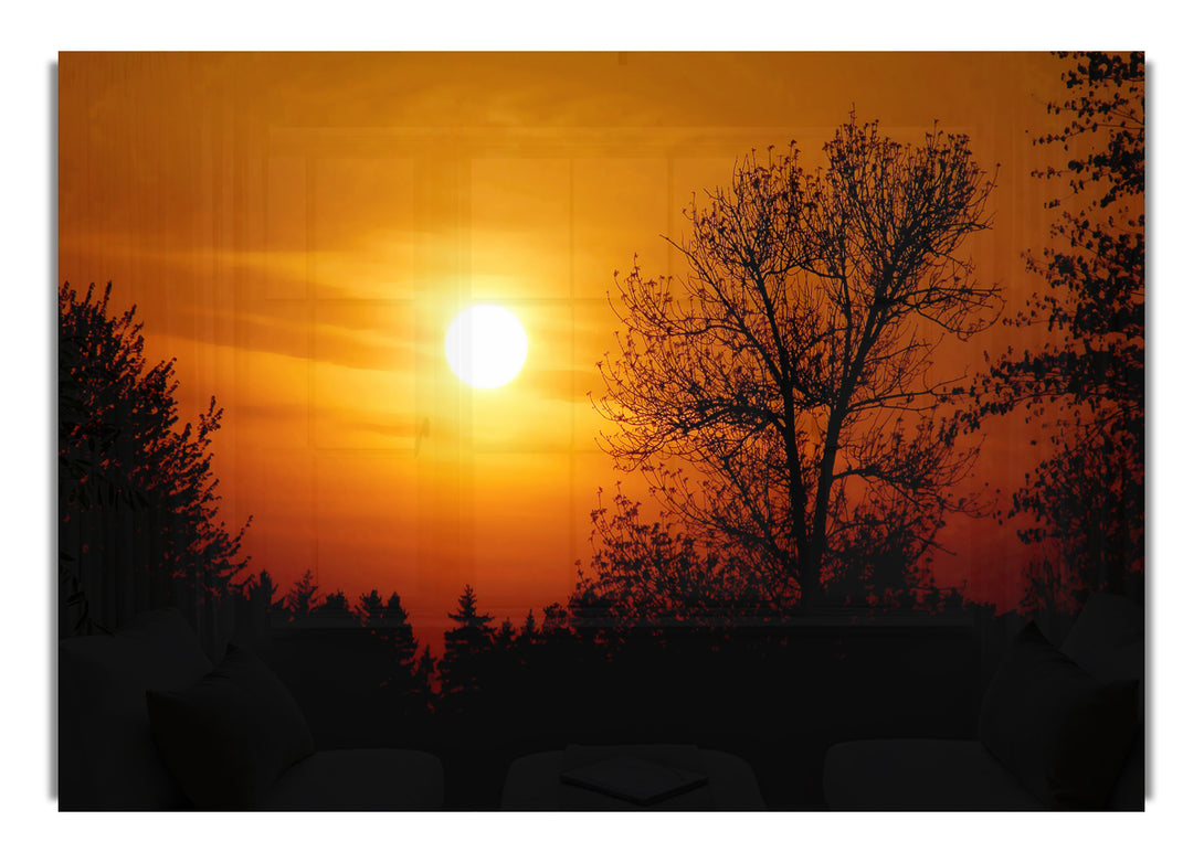 Orange Sunset Over Trees acrylic print, UV printed onto 5mm thick acrylic glass. Comes with everything you need to hang on your wall.
