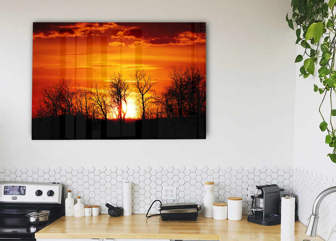 Orange Sunset Treeline acrylic print, UV printed onto 5mm thick acrylic glass. Comes with everything you need to hang on your wall.
