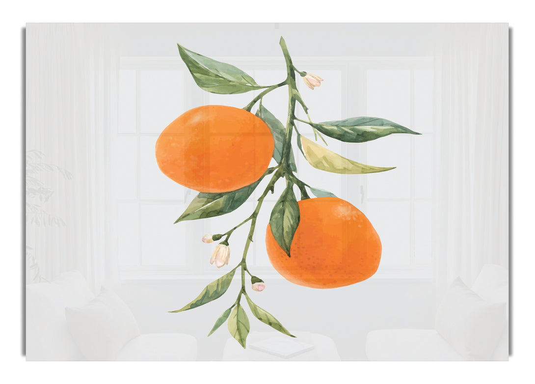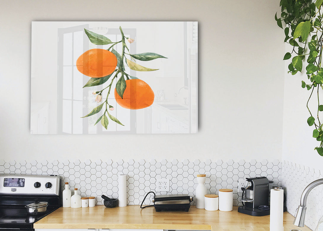 Oranges Fresh On The Branch acrylic print, UV printed onto 5mm thick acrylic glass. Comes with everything you need to hang on your wall.
