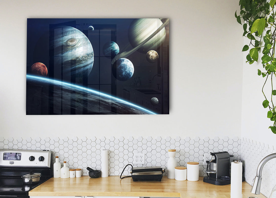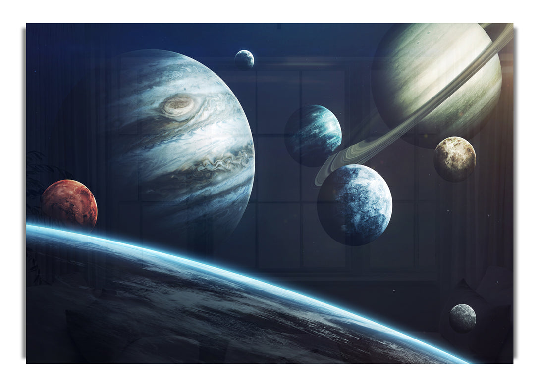 Out in space planets acrylic print, UV printed onto 5mm thick acrylic glass. Comes with everything you need to hang on your wall.