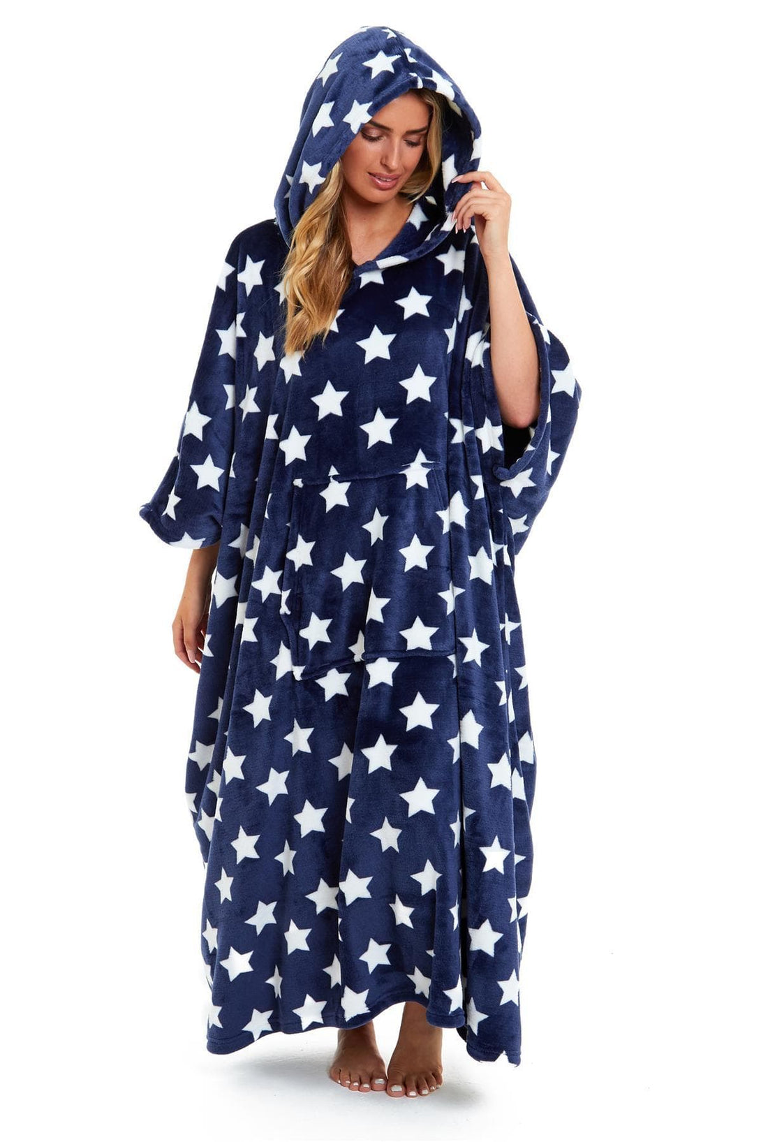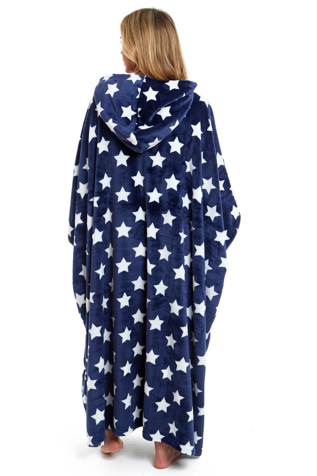 Oversized Hooded Fleece Poncho Blanket with Stars and Polka Dots Plush Wearable Blanket with Front Pocket for Adults Indoor Outdoor by Daisy Dreamer